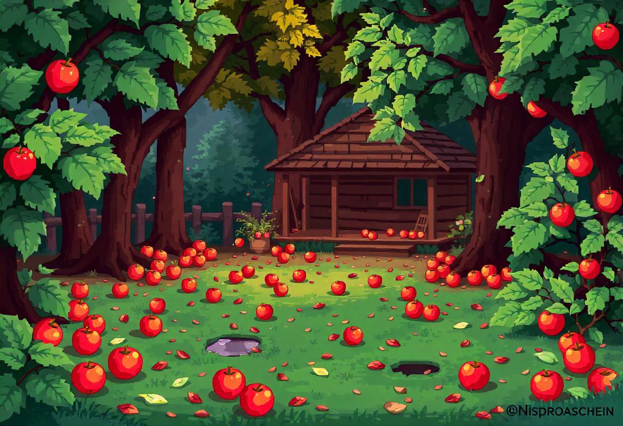 Red apples fall from trees near a small cabin