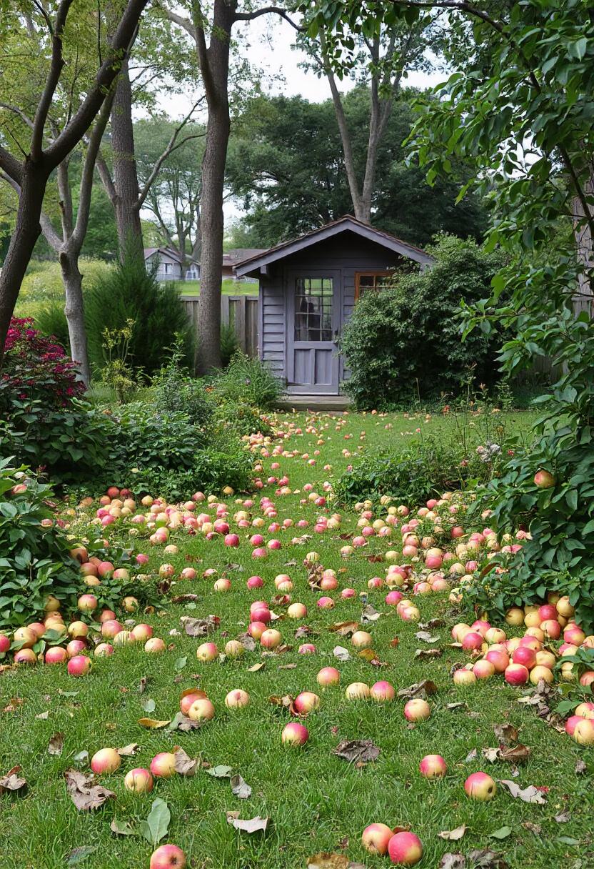 apples, autumn, backyard, country, fall, fallen, fruit, garden, grass, green, harvest, lawn, leaves, nature, outdoor, red, shed, trees, yard, yellow