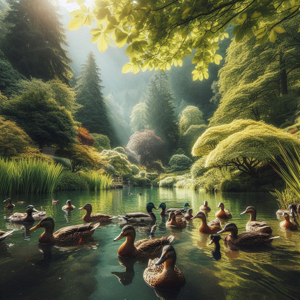 Ducks swim in a peaceful pond surrounded by lush greenery