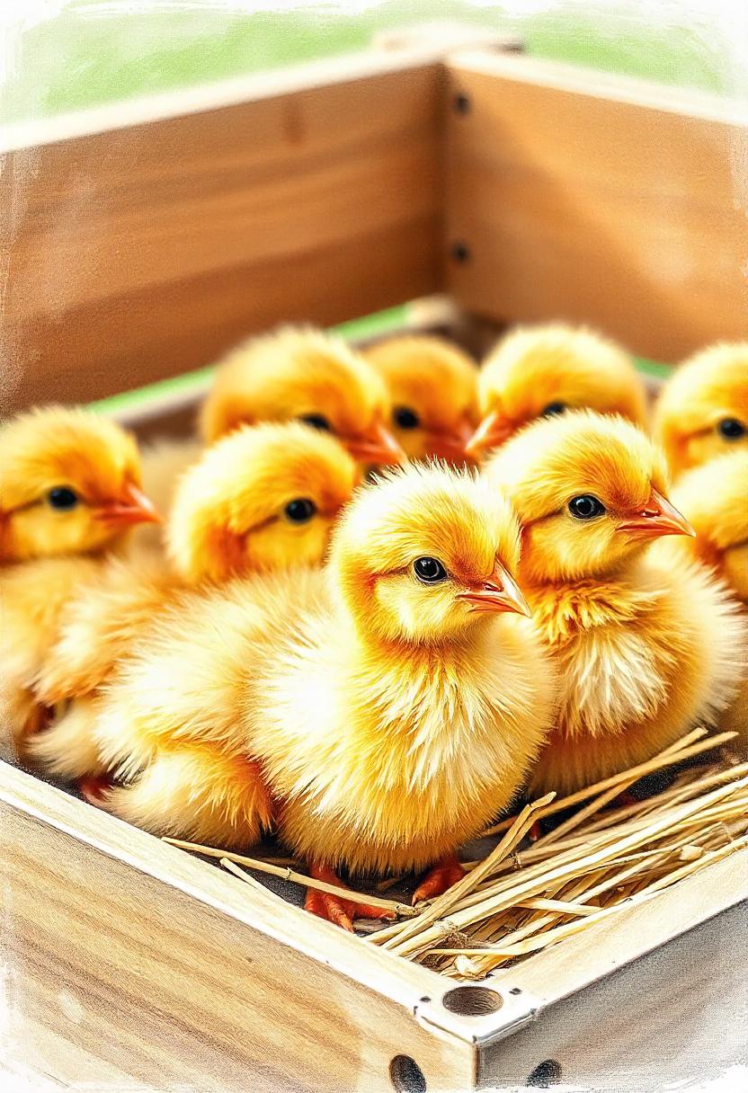 Baby chicks huddle together in a wooden box