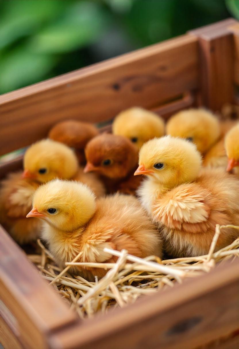 animal, animals, babies, baby, chick, chicks, crate, cute, farm, fluff, hatching, huddle, little, nest, poultry, small, straw, together, wooden, yellow