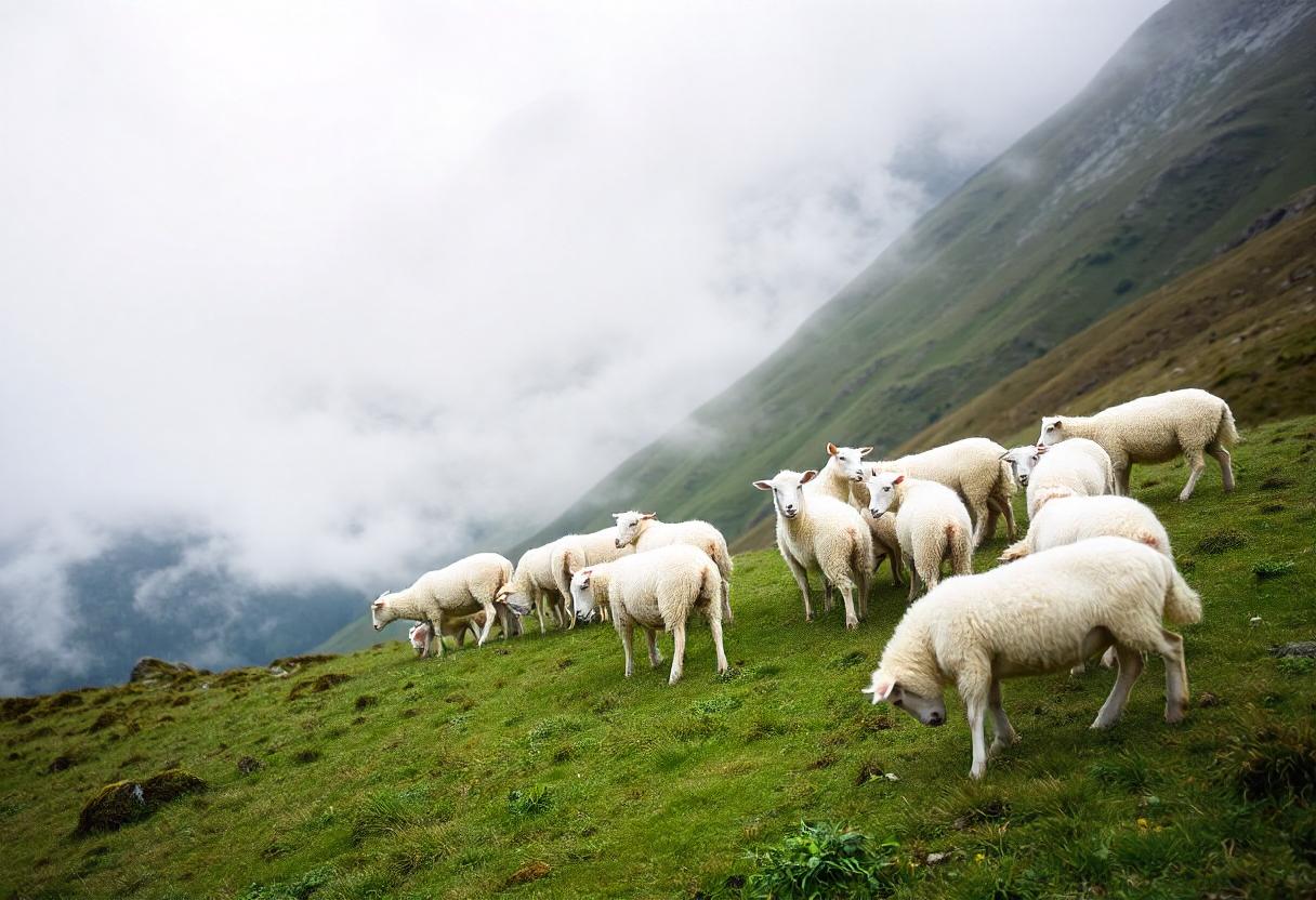 agriculture, animal, cloudy, environment, farm, flock, fog, grass, grazing, green, hills, landscape, meadow, mountain, nature, outdoor, rural, scenery, sheep, wildlife