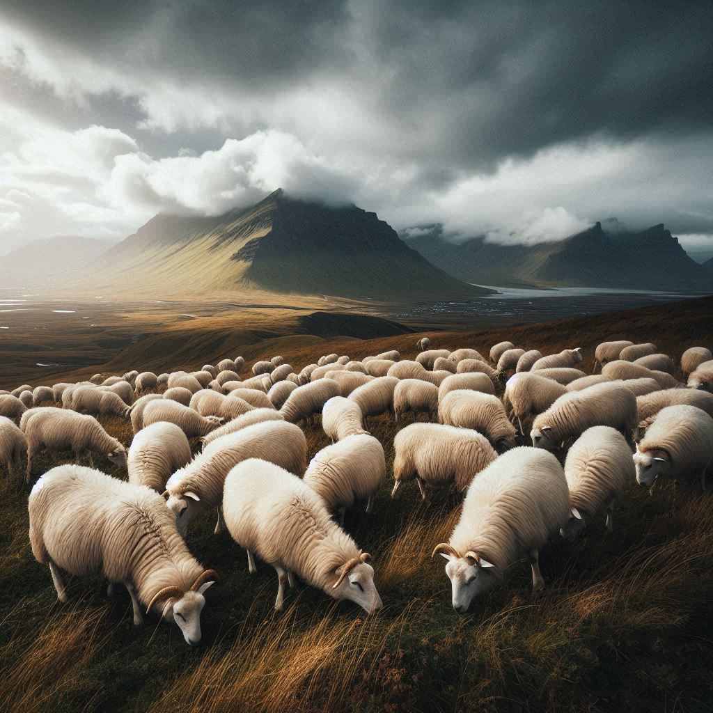 Sheep graze in an icelandic field with mountains