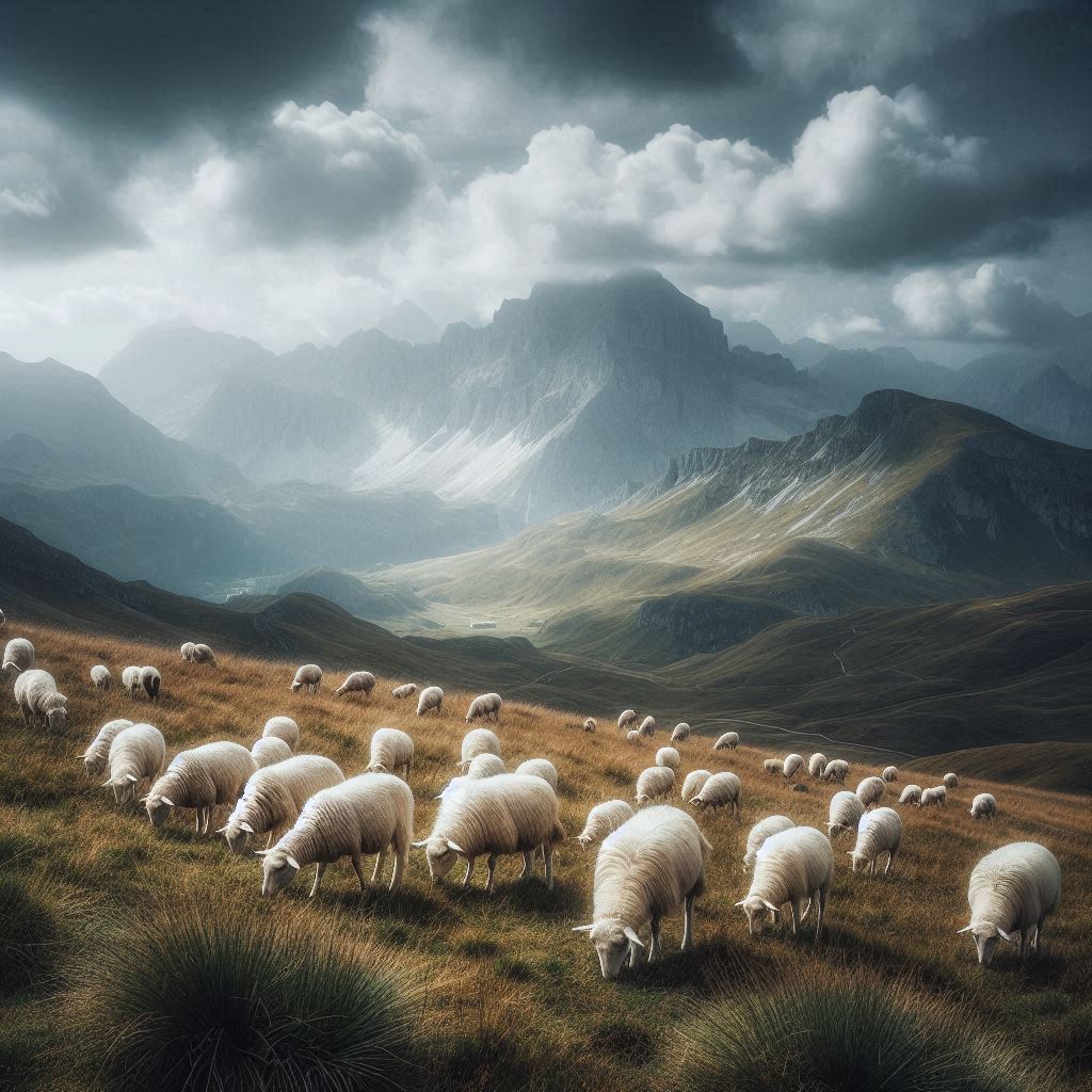 agriculture, animals, clouds, cloudy, countryside, farm, flock, grass, graze, hillside, landscape, mountain, nature, outdoor, rural, scenery, sheep, sky, valley, wildlife