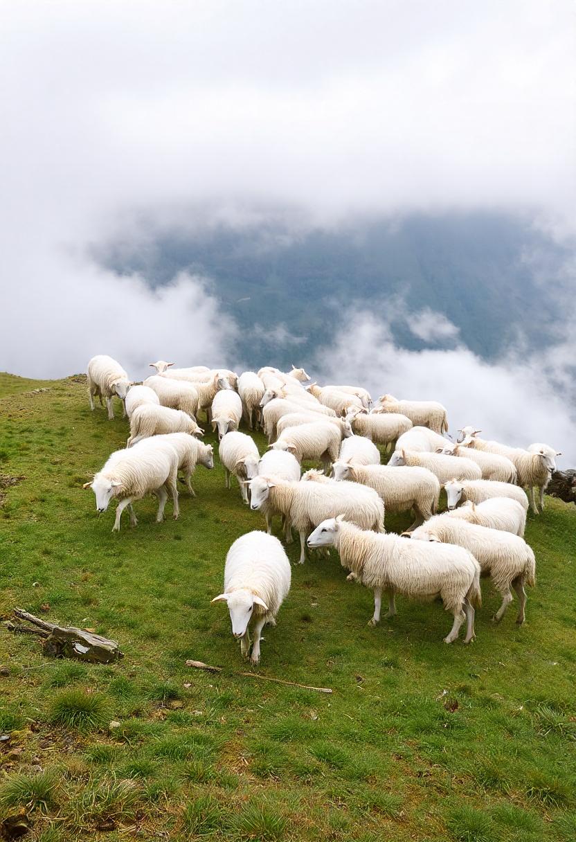 animals, clouds, countryside, farm, flock, fluffy, grassy, grazing, green, hillside, landscape, mountain, nature, pasture, rural, scenic, sheep, sky, white, wool