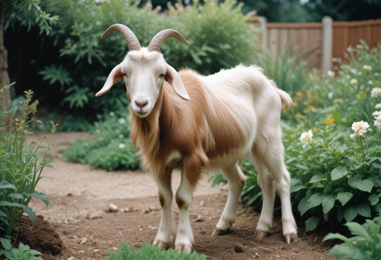 A brown and white goat stands in a garden
