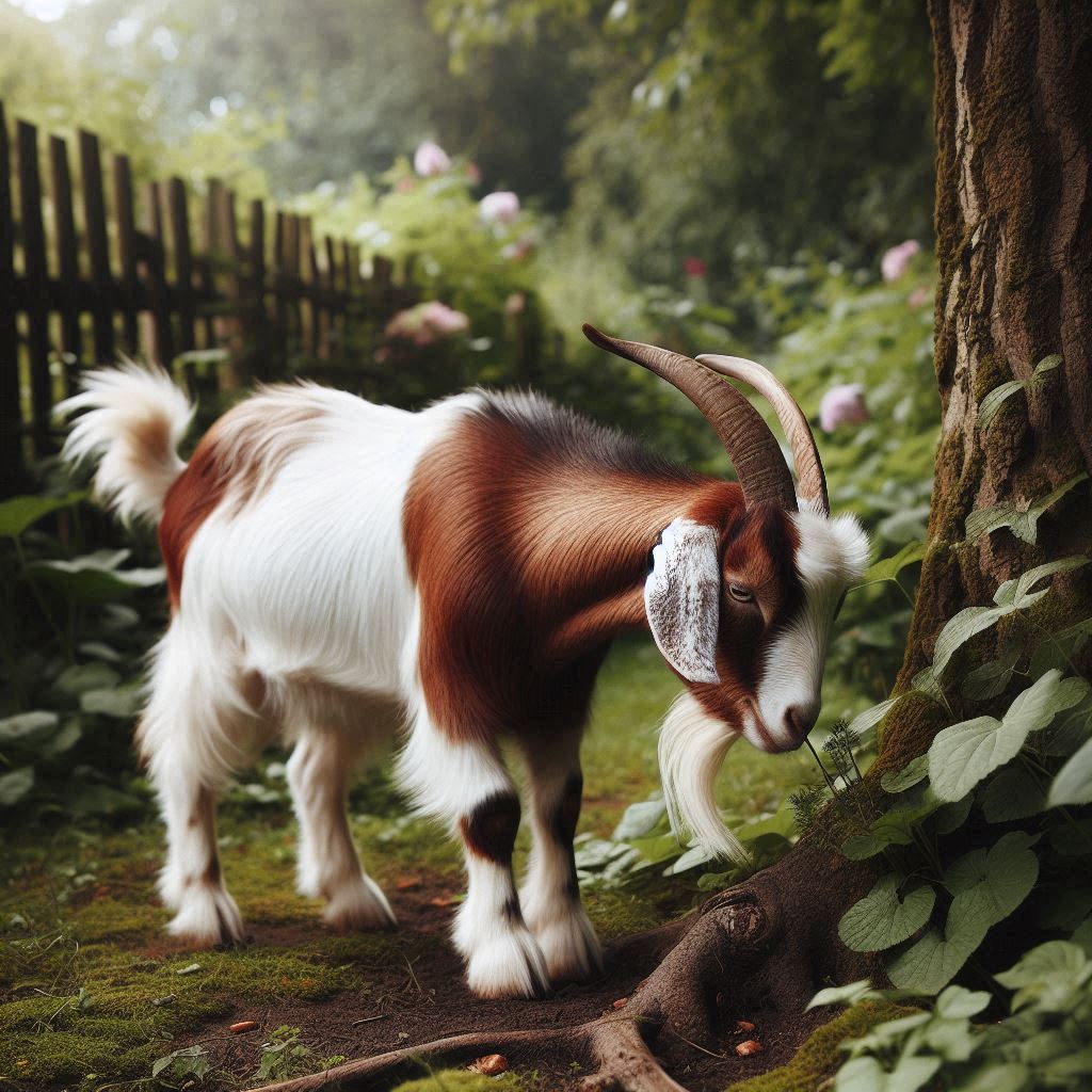 A brown and white goat grazes near a tree