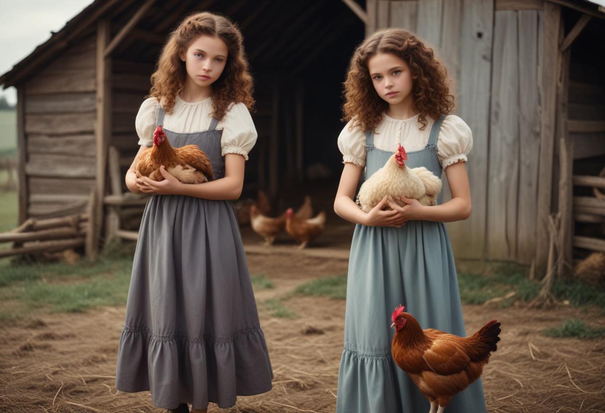 barn, brown, chicken, chickens, countryside, day, dress, dresses, farm, girl, girls, holding, outdoors, portrait, rural, rustic, standing, two, wooden, young