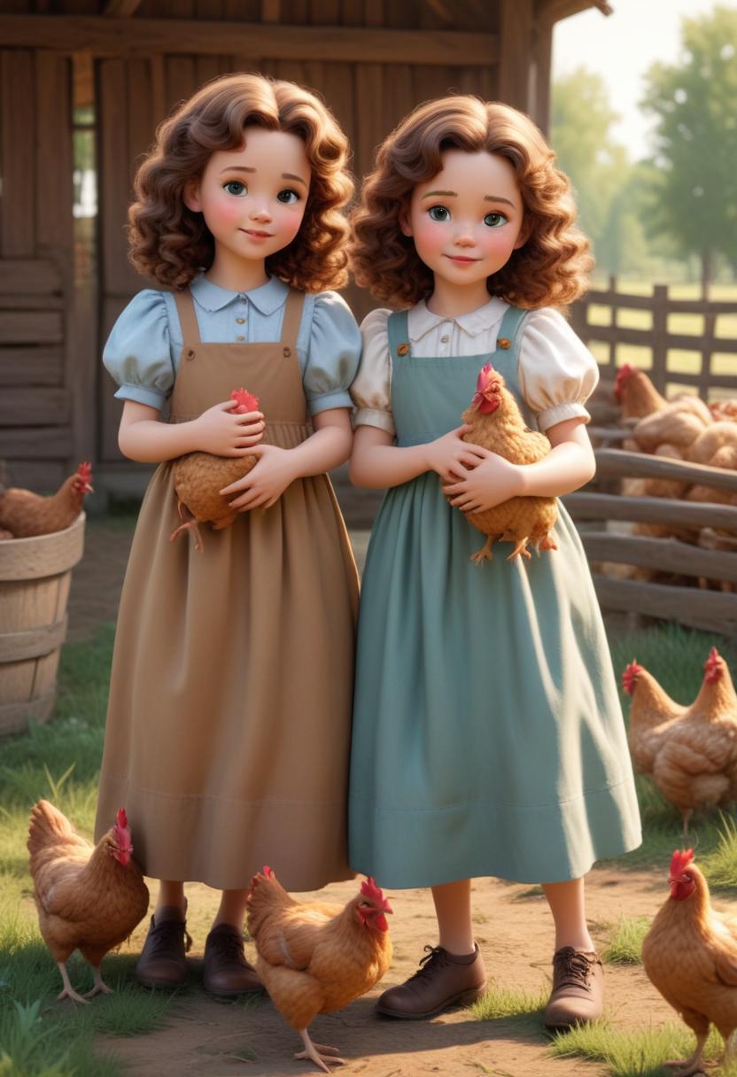 Two young girls in dresses are standing in a rural setting, each holding a brown chicken. Several other chickens are surrounding them, walking around.