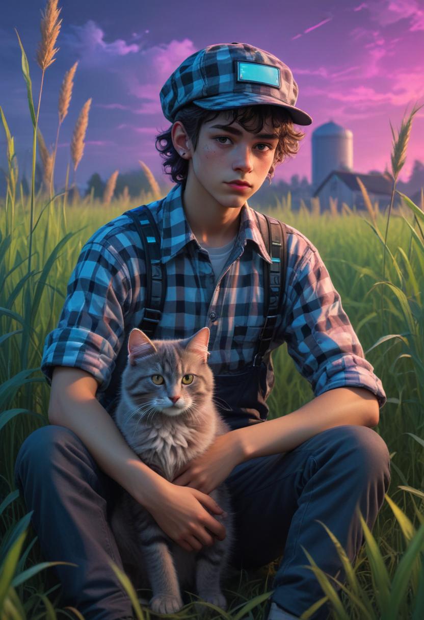 animal, cap, cat, dusk, evening, farm, field, grass, holding, man, nature, outdoors, pet, plaid, rural, shirt, sitting, sunset, twilight, young