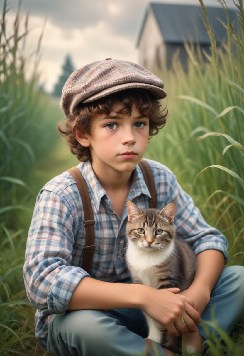 animal, barn, boy, cap, cat, countryside, farm, field, grass, nature, outdoors, pet, plaid, rural, shirt, sitting, summer, suspenders, tabby, young