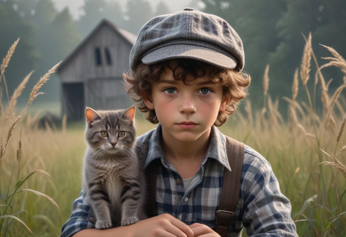 animal, background, barn, boy, cap, cat, countryside, farm, field, grass, gray, holding, lap, pet, plaid, rural, shirt, tall, wooden, young