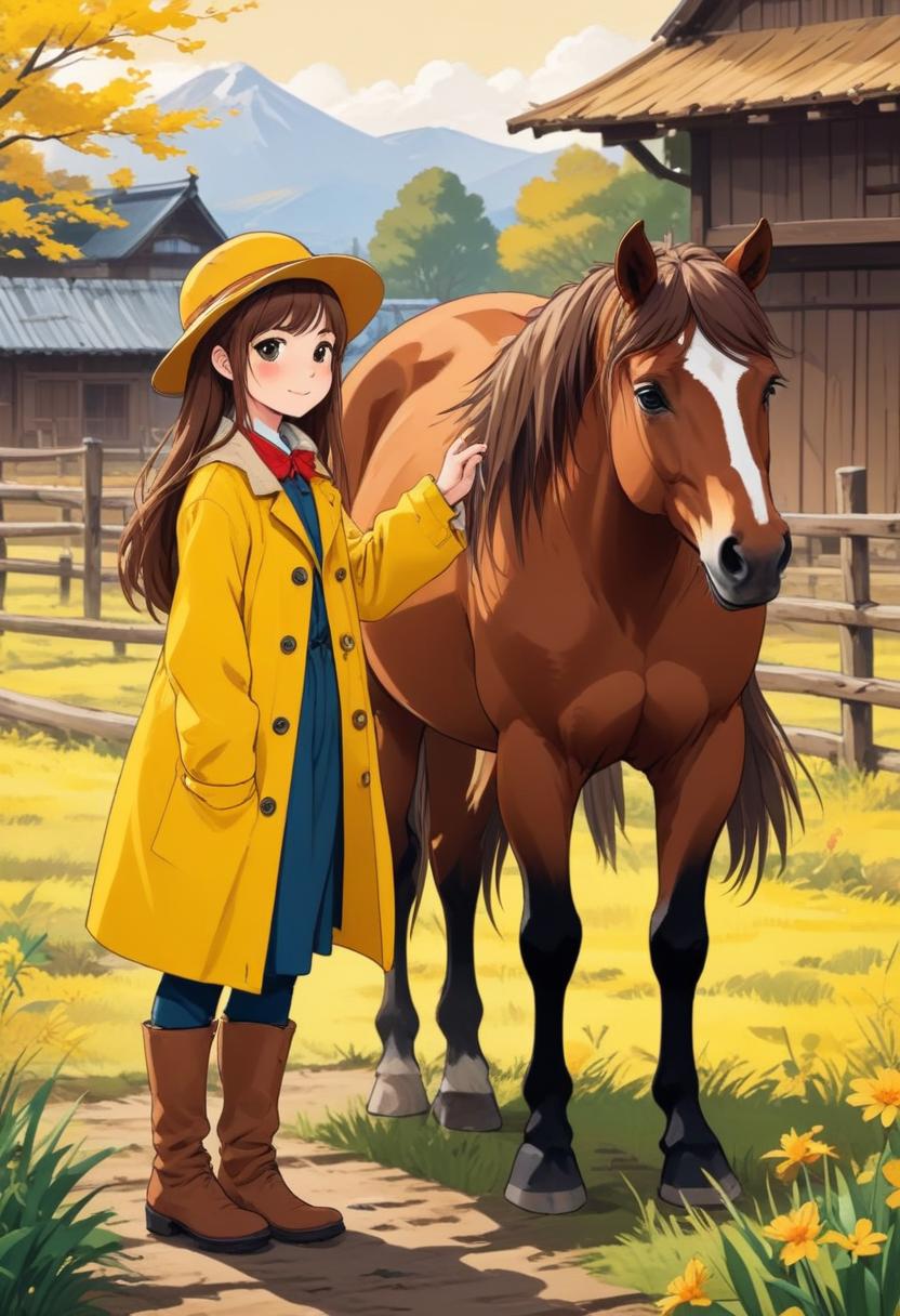 An anime-style girl with long brown hair, wearing a yellow coat and a hat, stands beside a brown horse