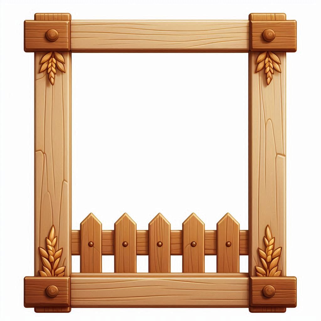 A wooden frame with wheat decorations on each side, a picket fence at the bottom, and a white background.