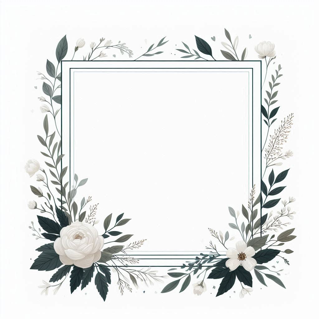 A square frame with a white background and a border of black lines. There are white flowers and green leaves on each side of the frame.