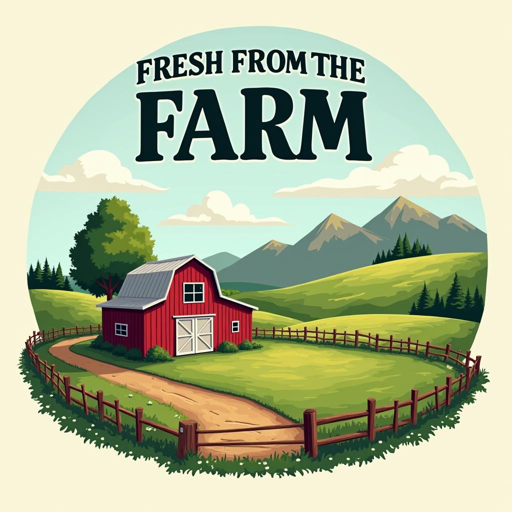 agriculture, barn, countryside, dirt, farm, fence, field, fresh, green, healthy, hills, illustration, landscape, mountains, nature, organic, path, red, rural, wooden
