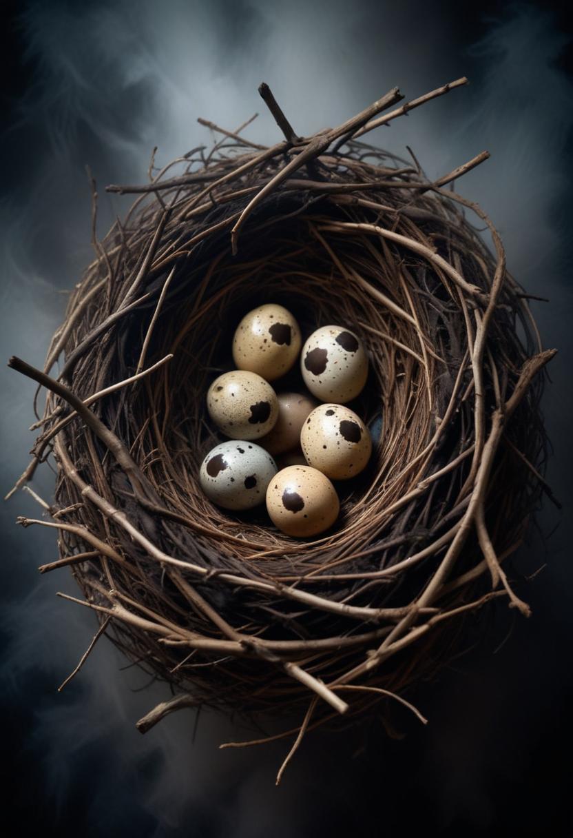 A bird's nest made of twigs holds a clutch of speckled quail eggs.