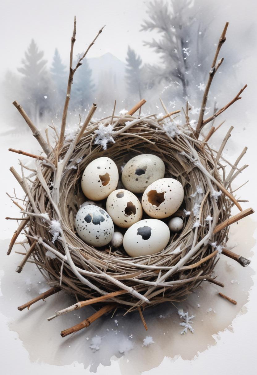 art, beautiful, bird, brown, delicate, eggs, forest, fragile, nature, nest, snow, snowflakes, snowy, speckled, twigs, watercolor, white, wildlife, winter, woodland