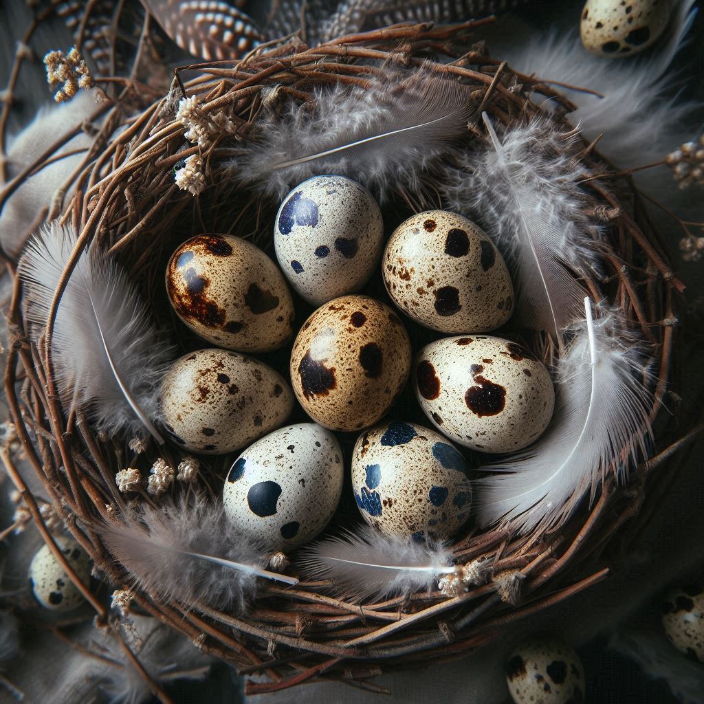 A bird's nest woven from twigs holds several speckled quail eggs. White feathers lay alongside the eggs in the nest.