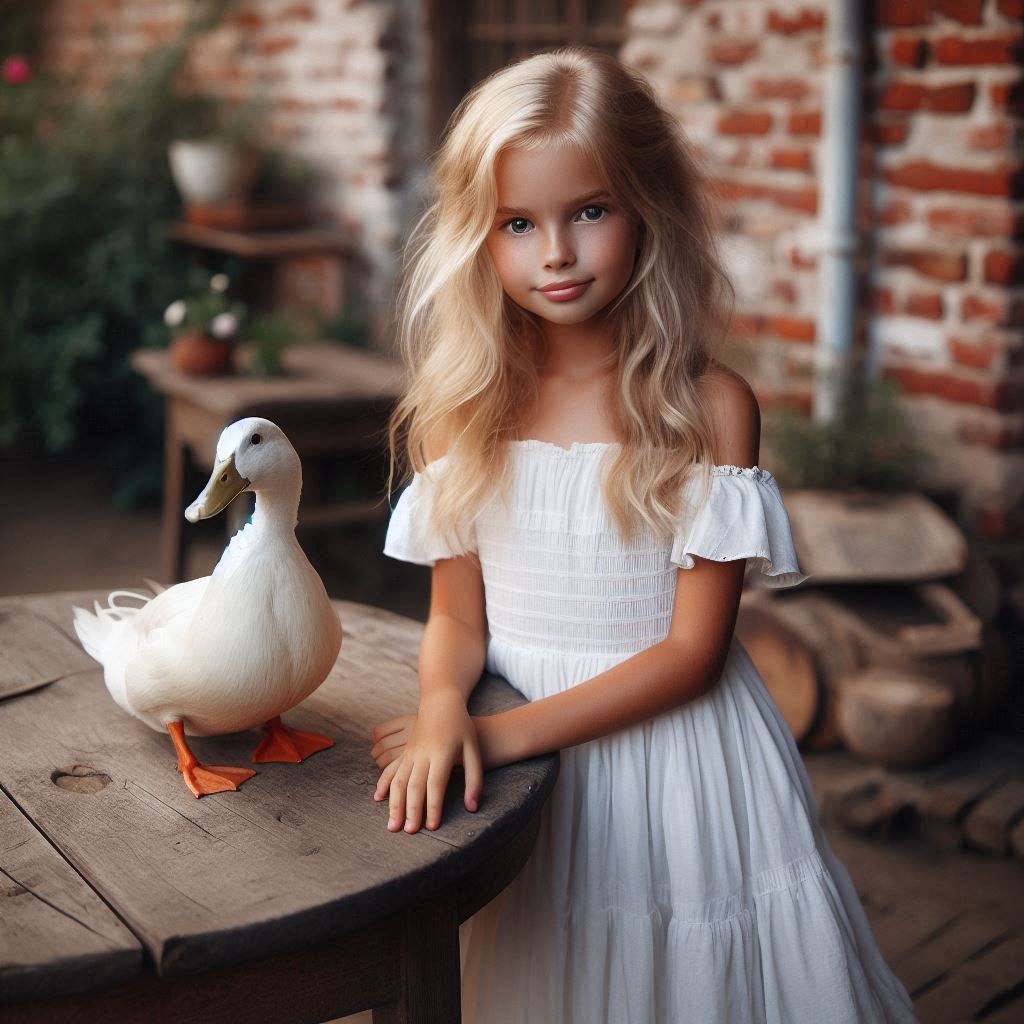 animal, blonde, child, country, cute, dress, duck, farm, female, girl, hair, pet, portrait, pretty, rural, standing, table, white, wooden, young