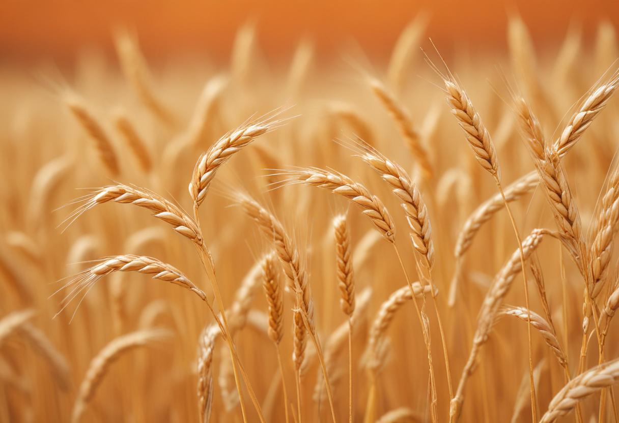 A close-up view of a field of golden wheat stalks swaying gently in the breeze under a bright, warm sun.