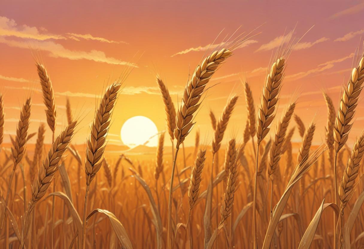 A field of ripe wheat stands tall against a sunset sky. The sun, a glowing orb, hangs low in the horizon, casting a golden light over the scene.