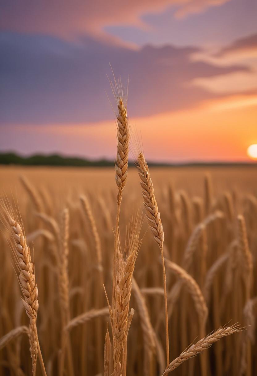 Wheat stalks stand tall in a field at sunset