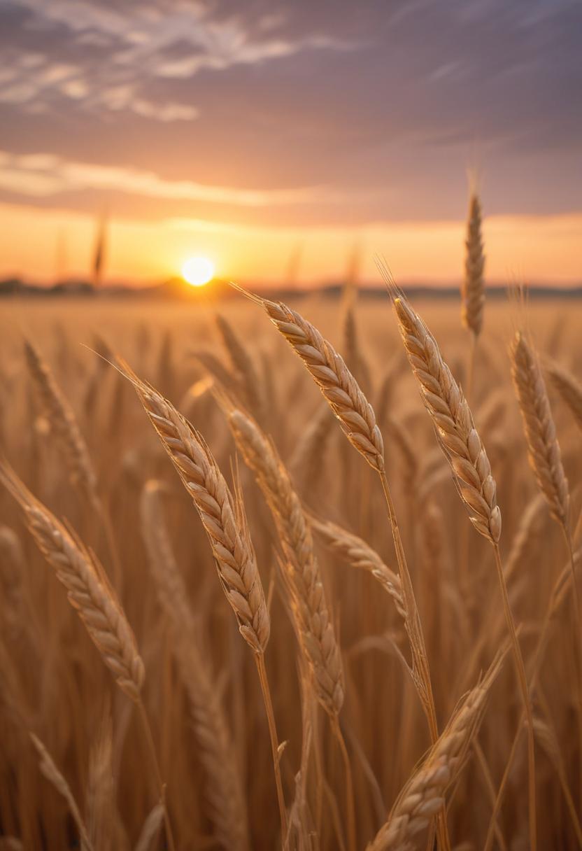 A field of wheat stalks sways in the wind as the sun sets in the distance, casting a warm glow over the landscape.