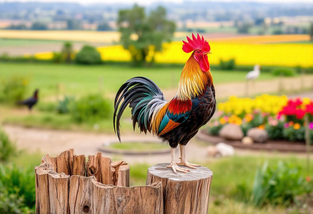 A rooster with colorful feathers is standing on a tree stump. The background shows a field of green grass, yellow flowers, and a garden.