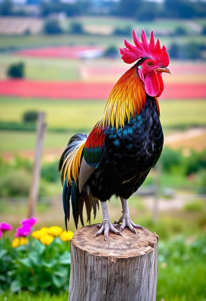 animal, beak, bird, blur, chicken, colorful, comb, farm, feathers, field, flowers, grass, green, red, rooster, standing, stump, tall, tree, wattle