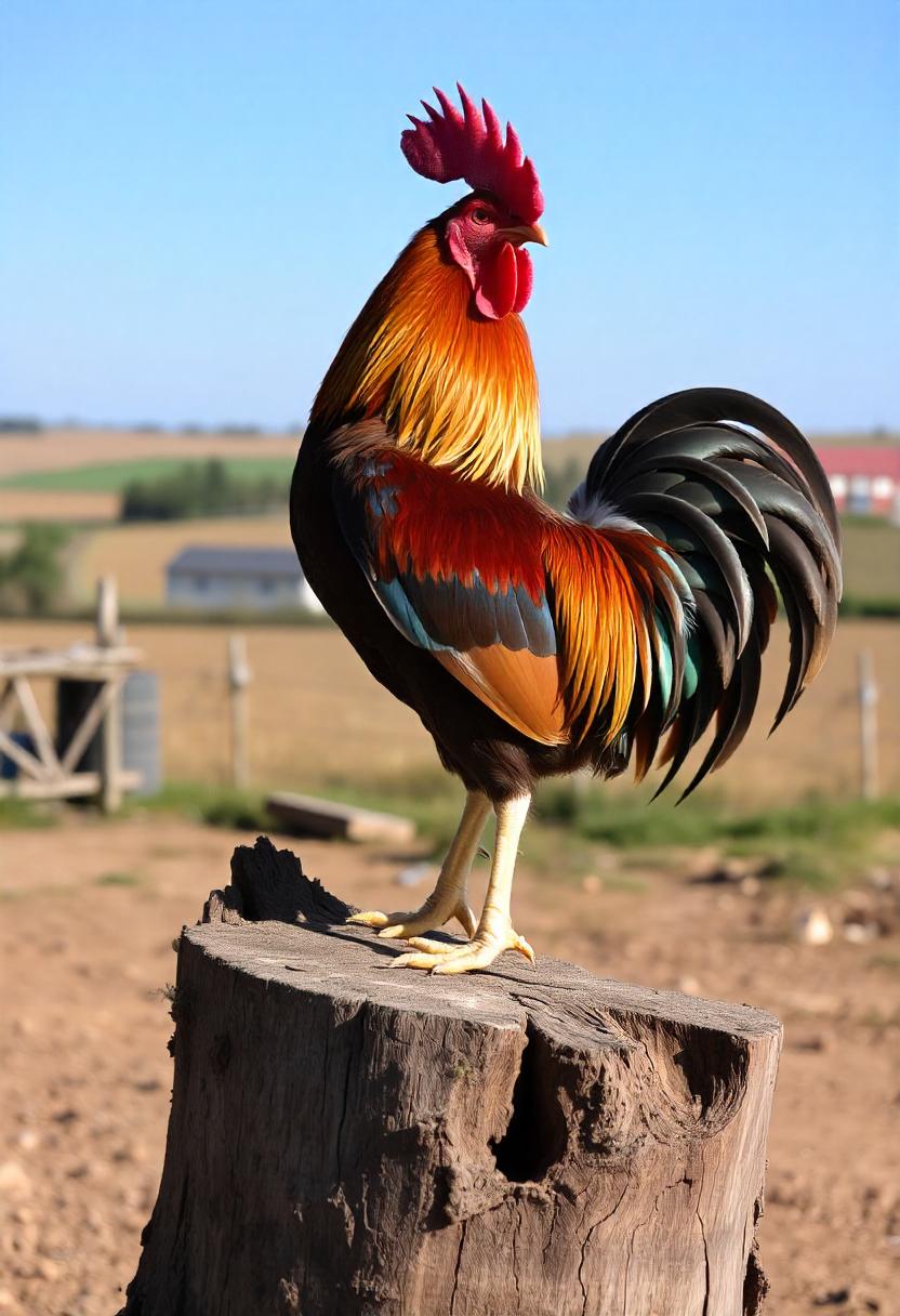 A rooster with colorful plumage stands atop a tree stump
