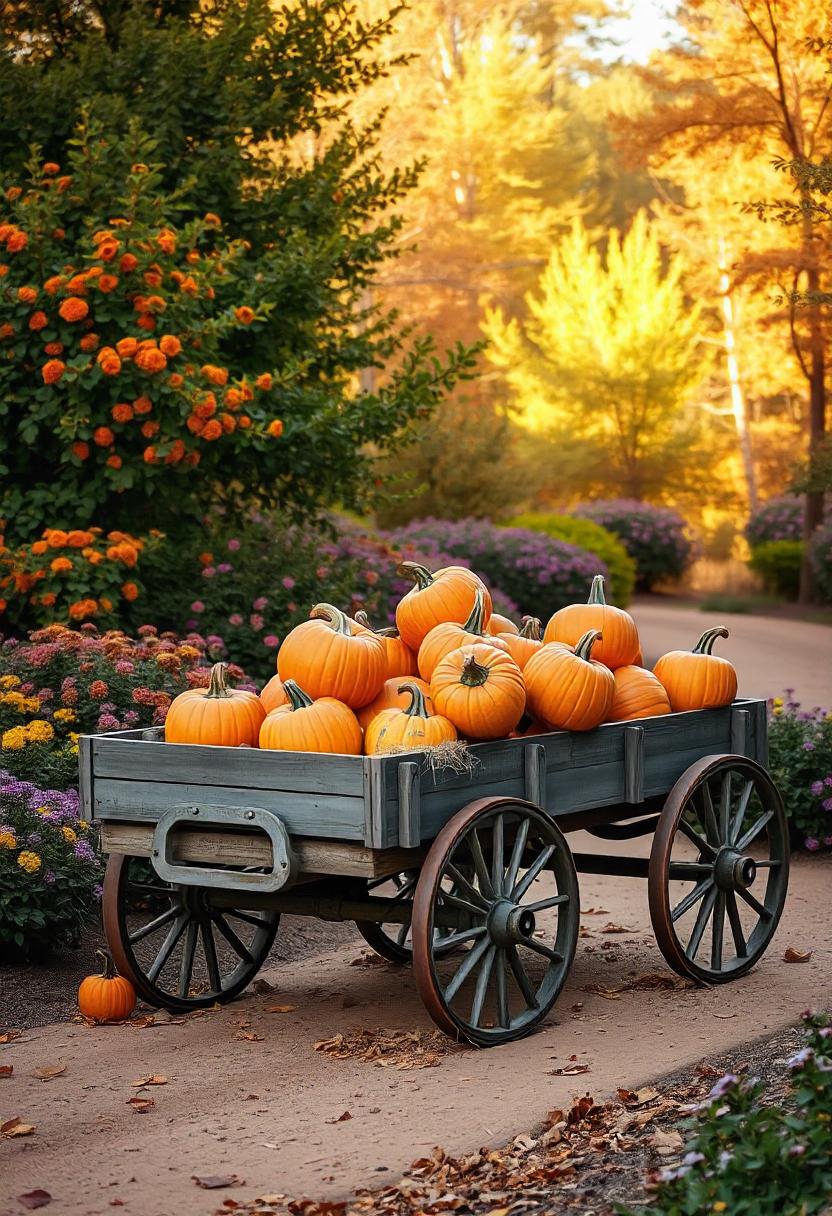 autumn, colorful, fall, flowers, gravel, harvest, landscape, leaves, nature, orange, outdoors, path, pumpkin, scenery, season, trees, wagon, wheel, wooden, yellow