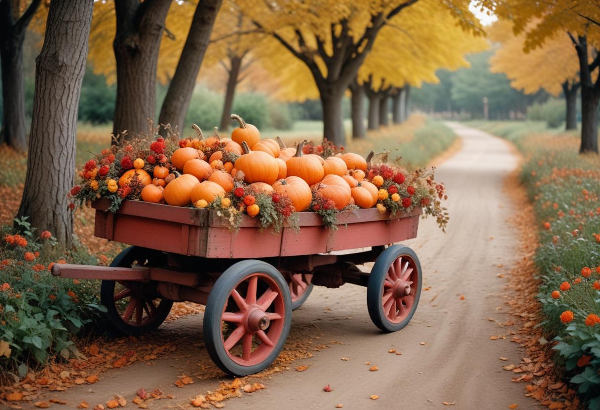 autumn, colors, country, fall, harvest, landscape, leaves, nature, orange, outdoor, path, pumpkins, red, rural, scenery, season, trees, wagon, woods, yellow