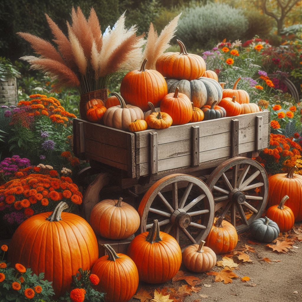 A wooden wagon filled with pumpkins sits in a fall garden. The wagon has wooden wheels and is surrounded by orange and yellow flowers.