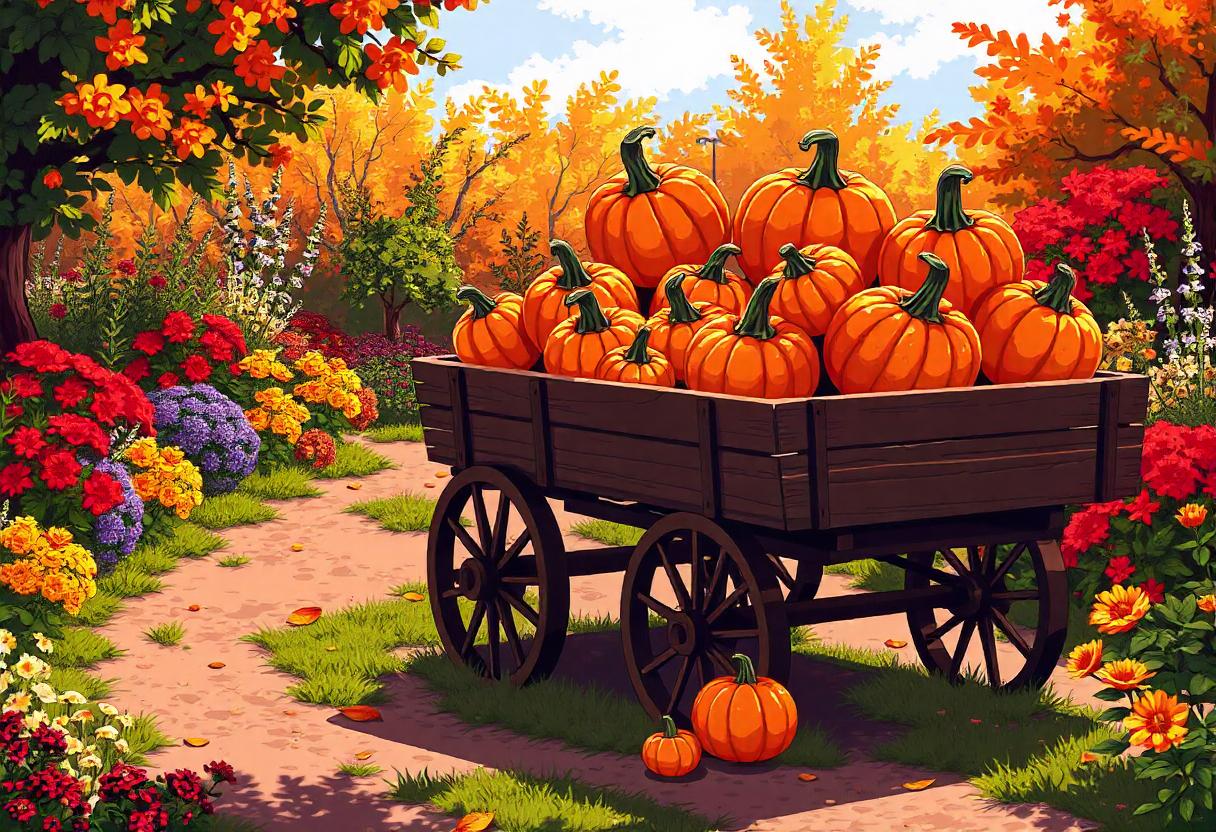 autumn, colorful, colors, country, dirt, fall, flower, garden, harvest, landscape, leaves, nature, orange, path, pumpkin, rural, tree, wagon, wheel, wooden