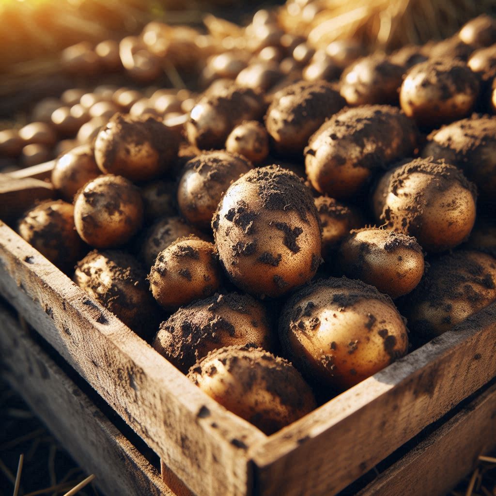 A crate of freshly harvested potatoes