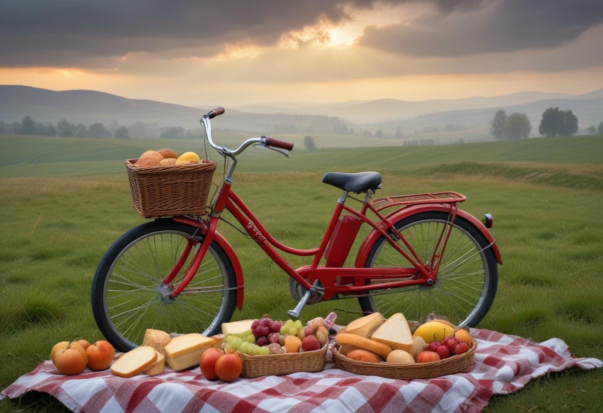 basket, bicycle, blanket, bread, cheese, field, forest, fruit, grass, hill, misty, nature, orange, outdoor, picnic, pink, red, sky, sunset, travel