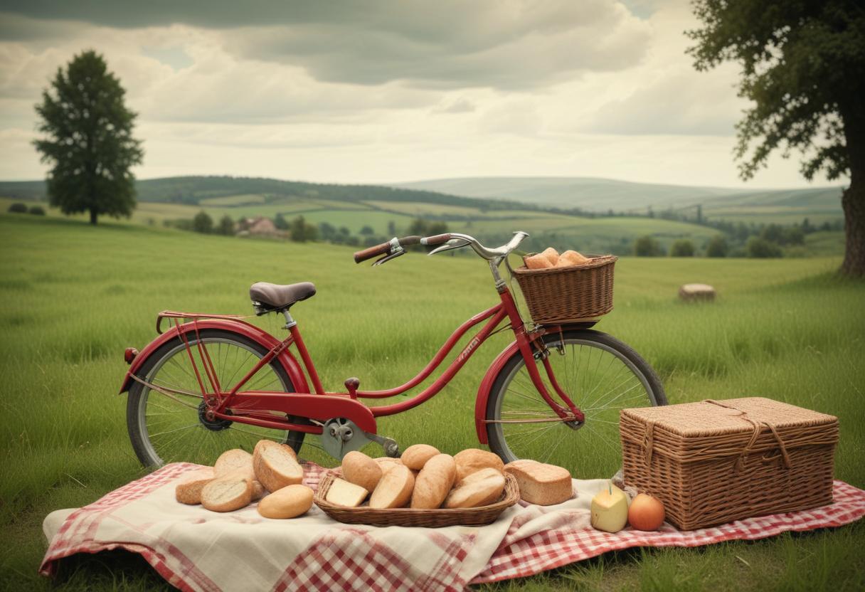 basket, bicycle, bike, blanket, bread, checkered, countryside, field, grass, green, loaves, nature, outdoor, picnic, red, rural, setup, summer, vintage, wicker