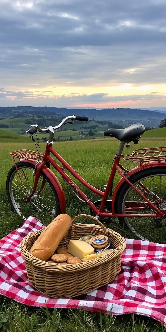 basket, bicycle, blanket, bread, checkered, cheese, clouds, crackers, field, food, grass, hill, landscape, nature, picnic, red, sky, summer, sunset, wicker