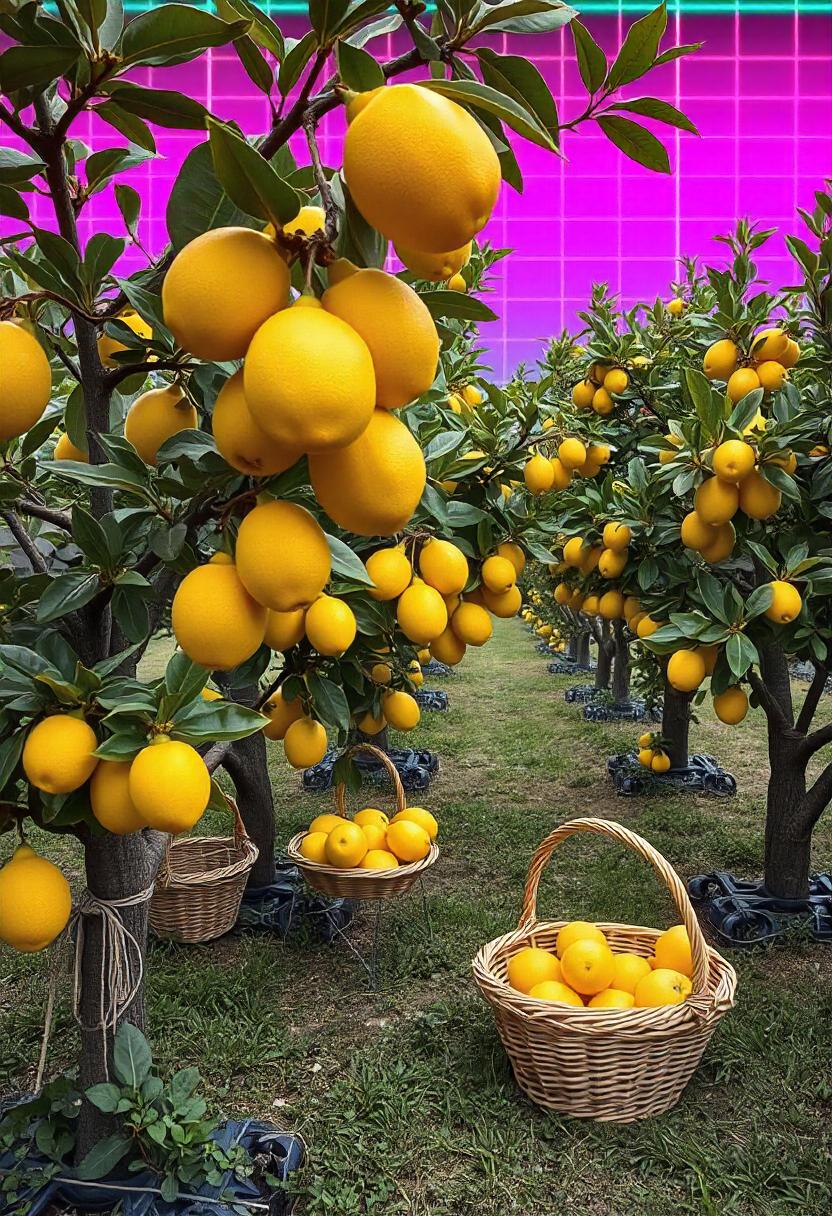 A row of lemon trees laden with ripe fruit in a sunny orchard