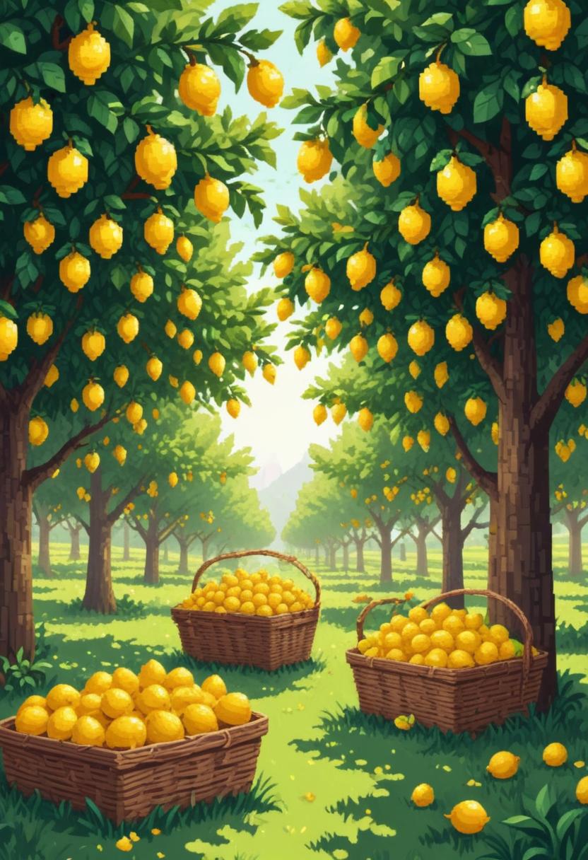 A sunny grove of lemon trees with ripe fruit hanging from the branches, three baskets filled with lemons sit on the ground.