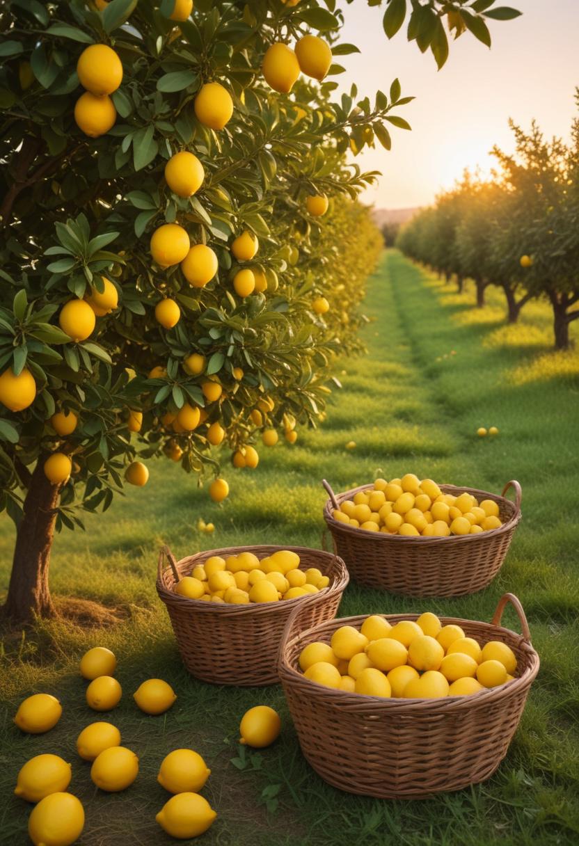 A lemon orchard in the late afternoon. The sun shines brightly, casting a warm glow over the scene