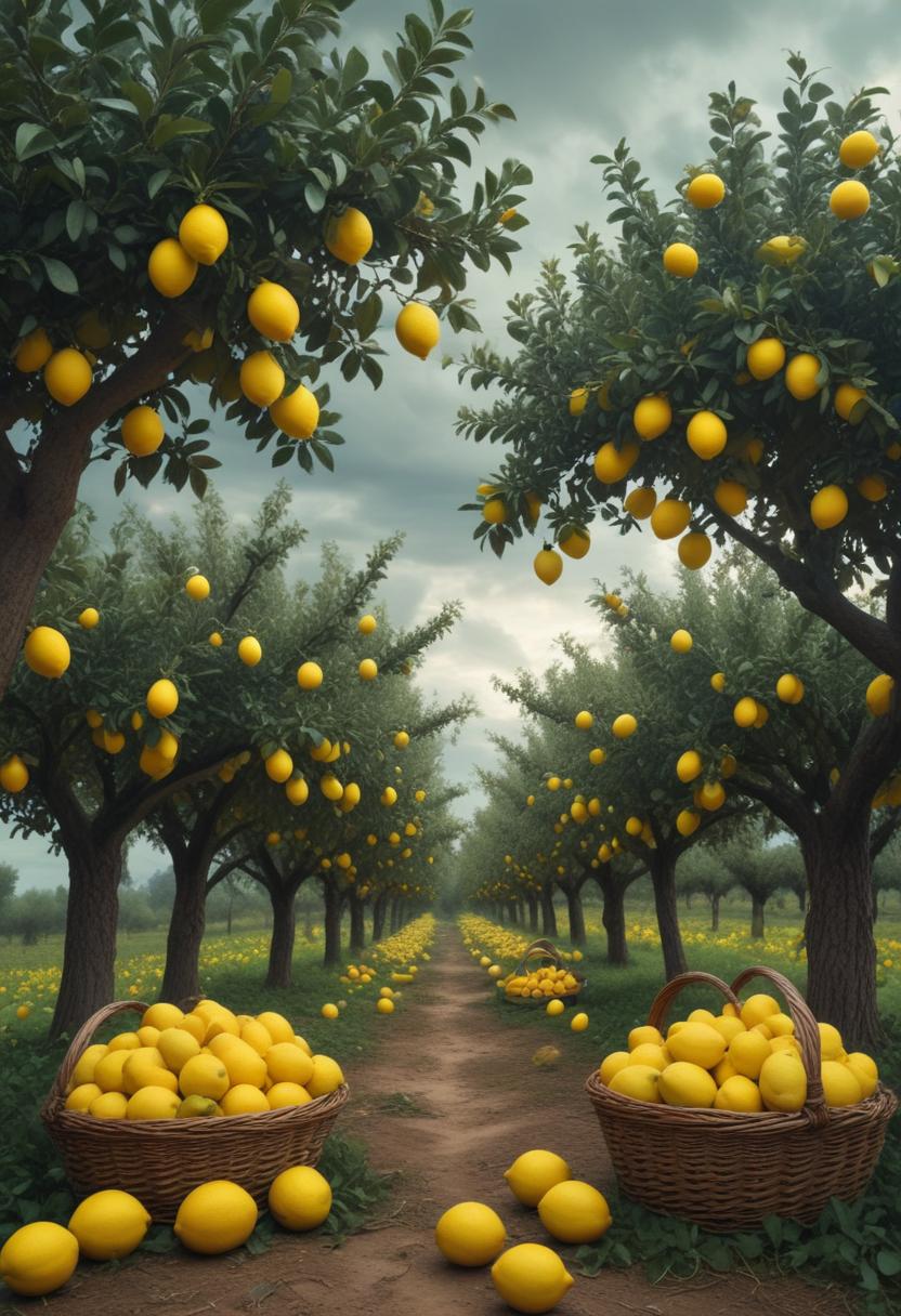 A dirt path lined with lemon trees leads through an orchard. Lemons hang from the branches, and some have fallen to the ground