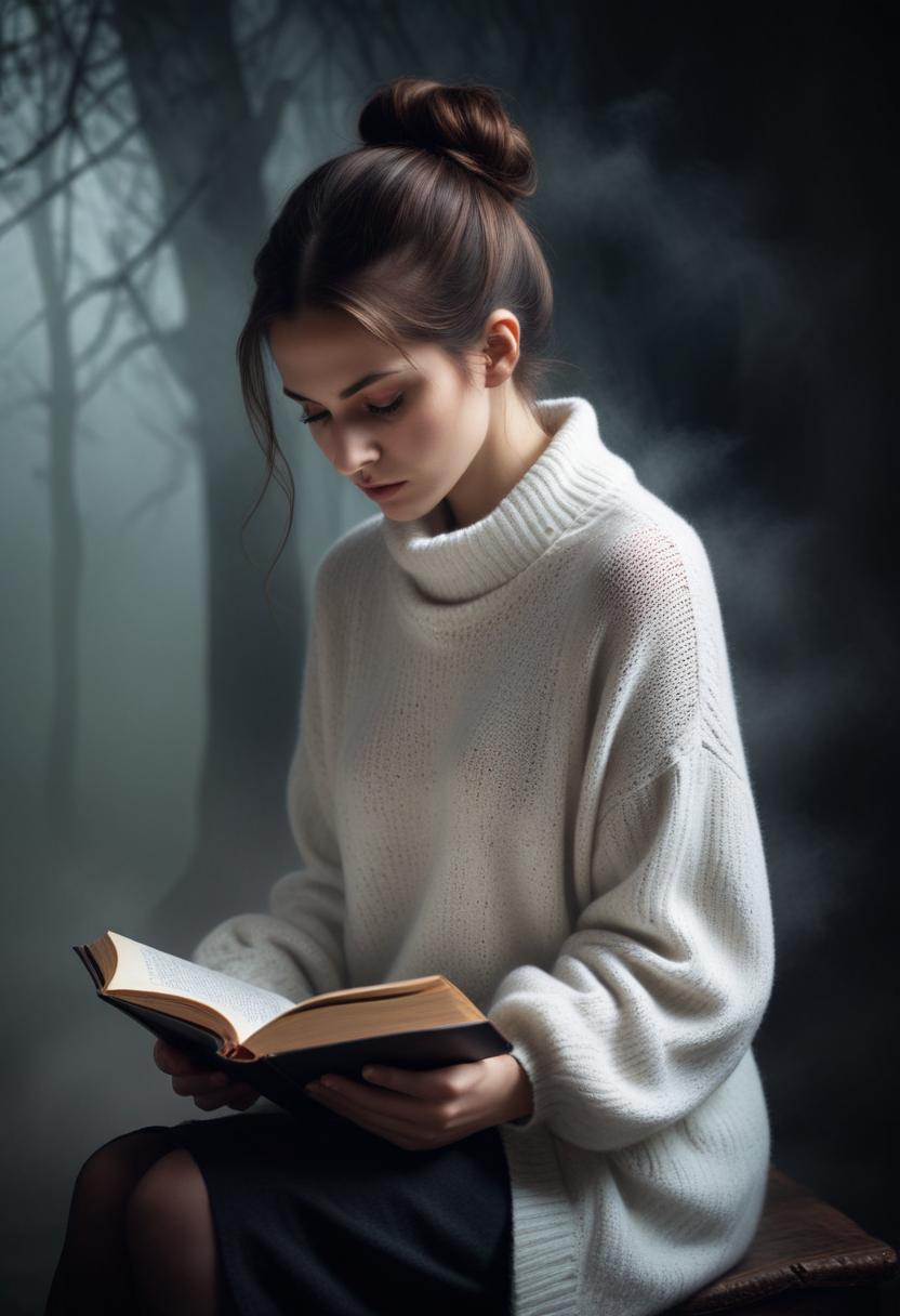 book, bun, casual, dark, dim, fashion, female, hair, lit, model, portrait, pose, reading, room, sit, sitting, style, sweater, white, woman