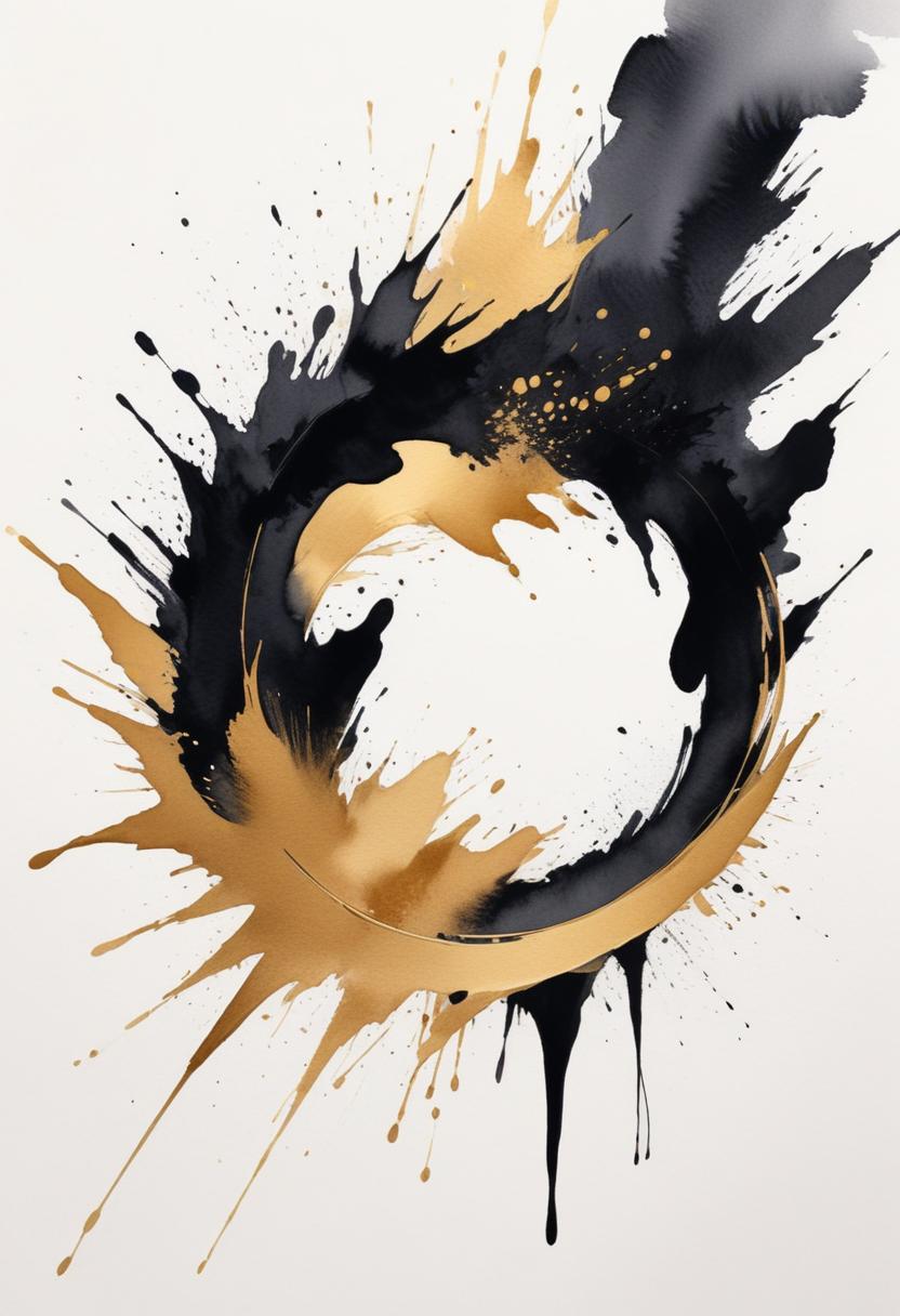 Black and gold paint splatter art on white canvas