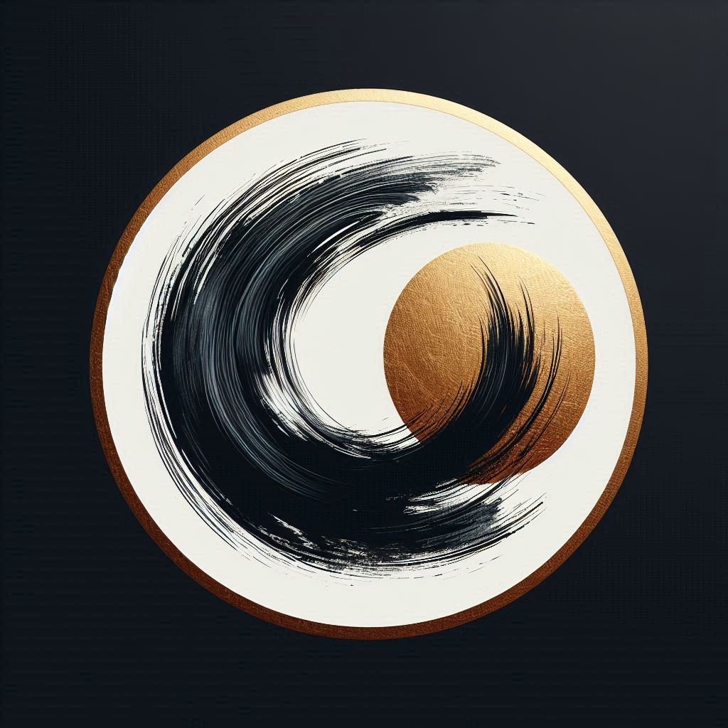 A circular artwork features a large black brushstroke that swirls around a smaller gold circle. The artwork is framed with a thin gold border.