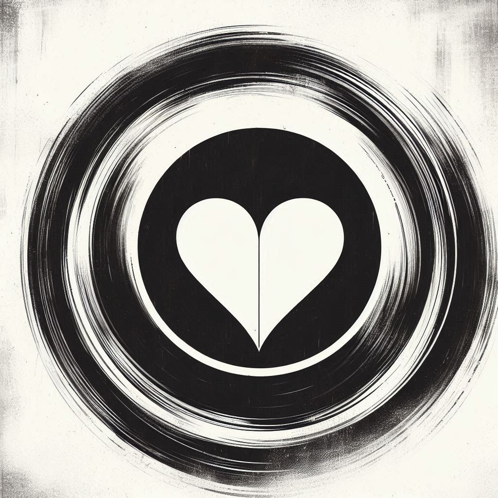 A white heart shape is shown within a black circle. The circle is surrounded by a larger black ring with brush stroke markings.