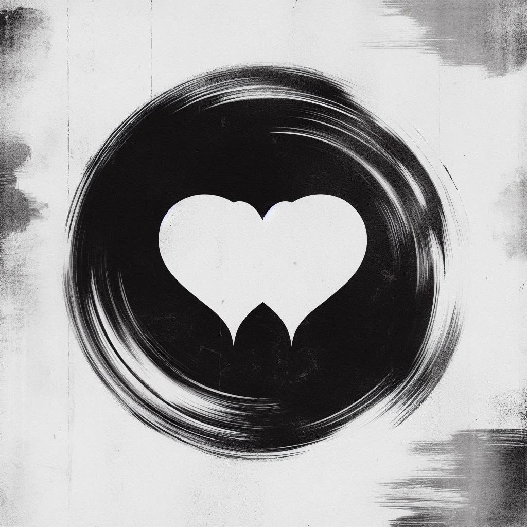A white heart shape is centered within a black circle that has brushstroke-like details. The background is textured and light gray.