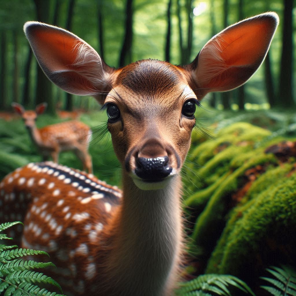 A young deer with brown and white spots stands in a forest, looking directly at the camera. The deer has large ears and large, dark eyes