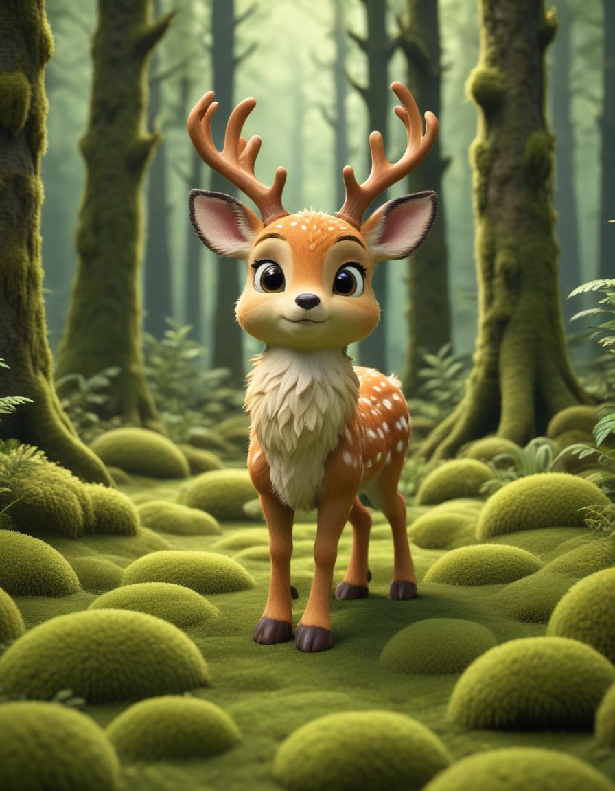 A cartoon deer with large eyes and brown fur stands in a green forest. The forest floor is covered in mossy mounds.